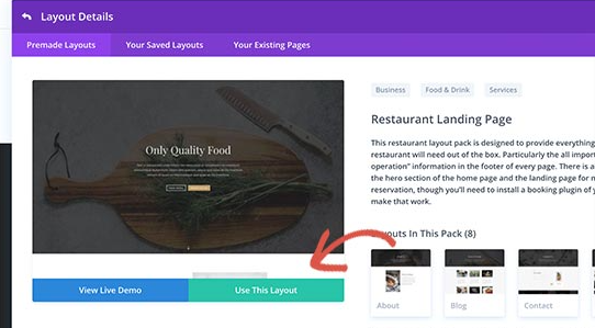 When you click on any of the desired templates, it’ll open different layouts related to that template. Suppose you are looking for a landing page for Restaurant; upon clicking the landing page template, it’ll open different layouts related to the Restaurant theme. Select the template you want to include by clicking the “use this layout” option to continue.