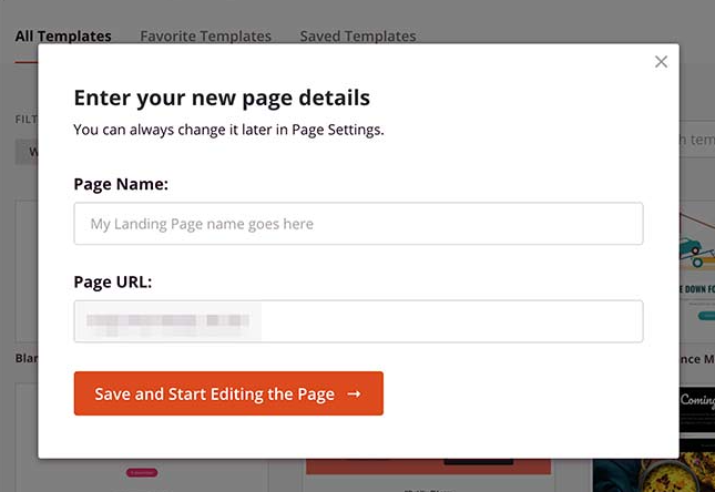 After selecting your desired template, a pop-up will appear where you can put your landing page name and URL.