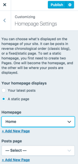 And then open the Homepage settings. Click on the “A static page” and select the landing page that you have created from the dropdown Homepage menu. Now, you can open the preview tab and see that it displays your landing page as the front page of your website.